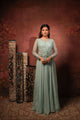 Dull mint gathered gown with short shrug