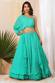 Teal green one shoulder cro...Bright pink drape skirt with matching crop top paired with baby pink jacket with embroidered belt.