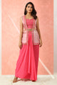 Bright pink drape skirt wit...Burgundy draped skirt with crop top, crushed jacket and belt.