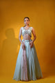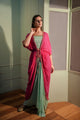 Aqua flared and gathered sk...Hot pink ruffle jacket with crop top and draped skirt.