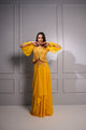 Mustard yellow double layer...Mustard Cowl draped crop top with tassles and rushed tassled skirt set.