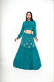 Teal green crepe crop top a...Mustard yellow cape jacket with crop top and draped shaded skirt.