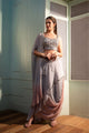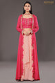 Hot pink ruffle jacket with...Sea green draped skirt with crop top and contrast poncho tie up jacket